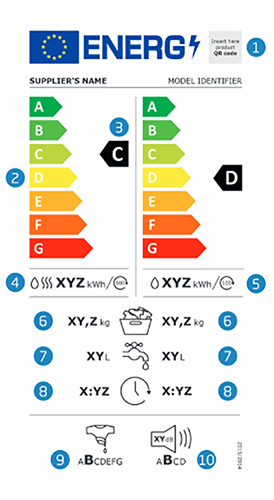 L'étiquette est divisée en deux parties : à gauche pour un cycle complet (lavage + séchage), à droite pour un cycle de lavage uniquement.